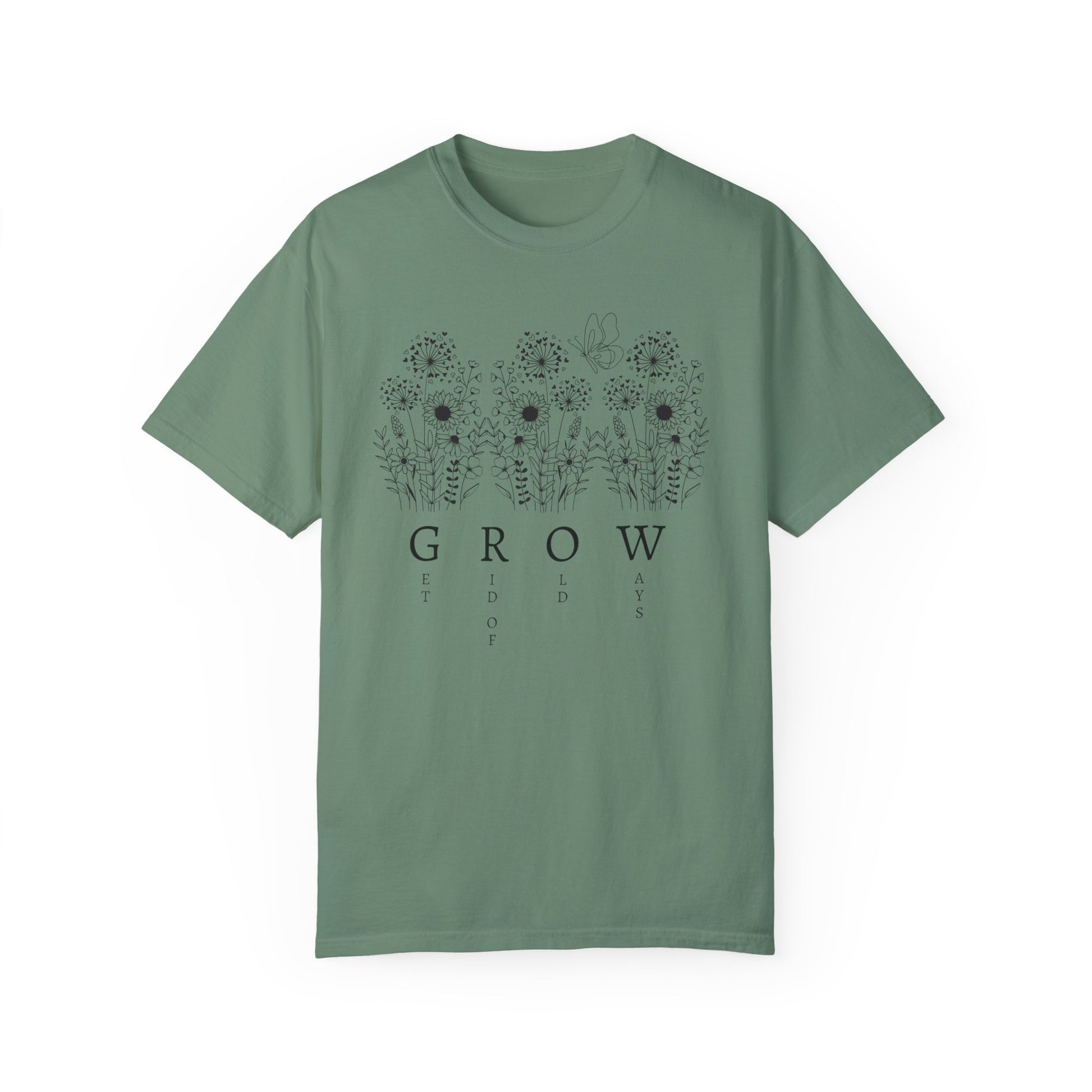 Our "Grow Through It" tee features delicate wildflowers in a hand-drawn style, centered around a calming reminder to release the old and embrace new beginnings. The vertical message beneath "GROW" reads: "Get rid of old ways" - a gentle nudge toward personal growth. Pair this tee with jeans, biker shorts, or wear oversized for a cozy, grounded vibe.