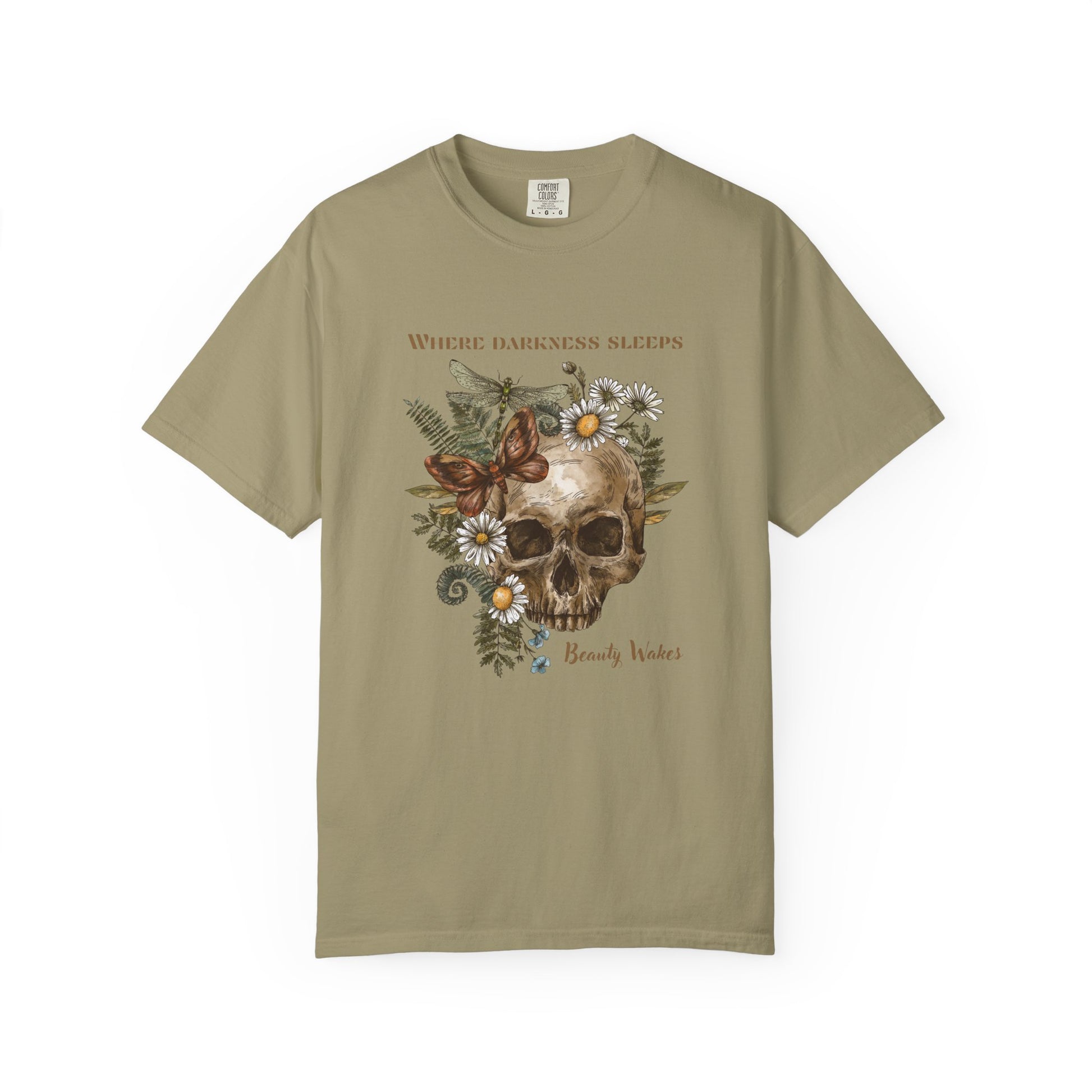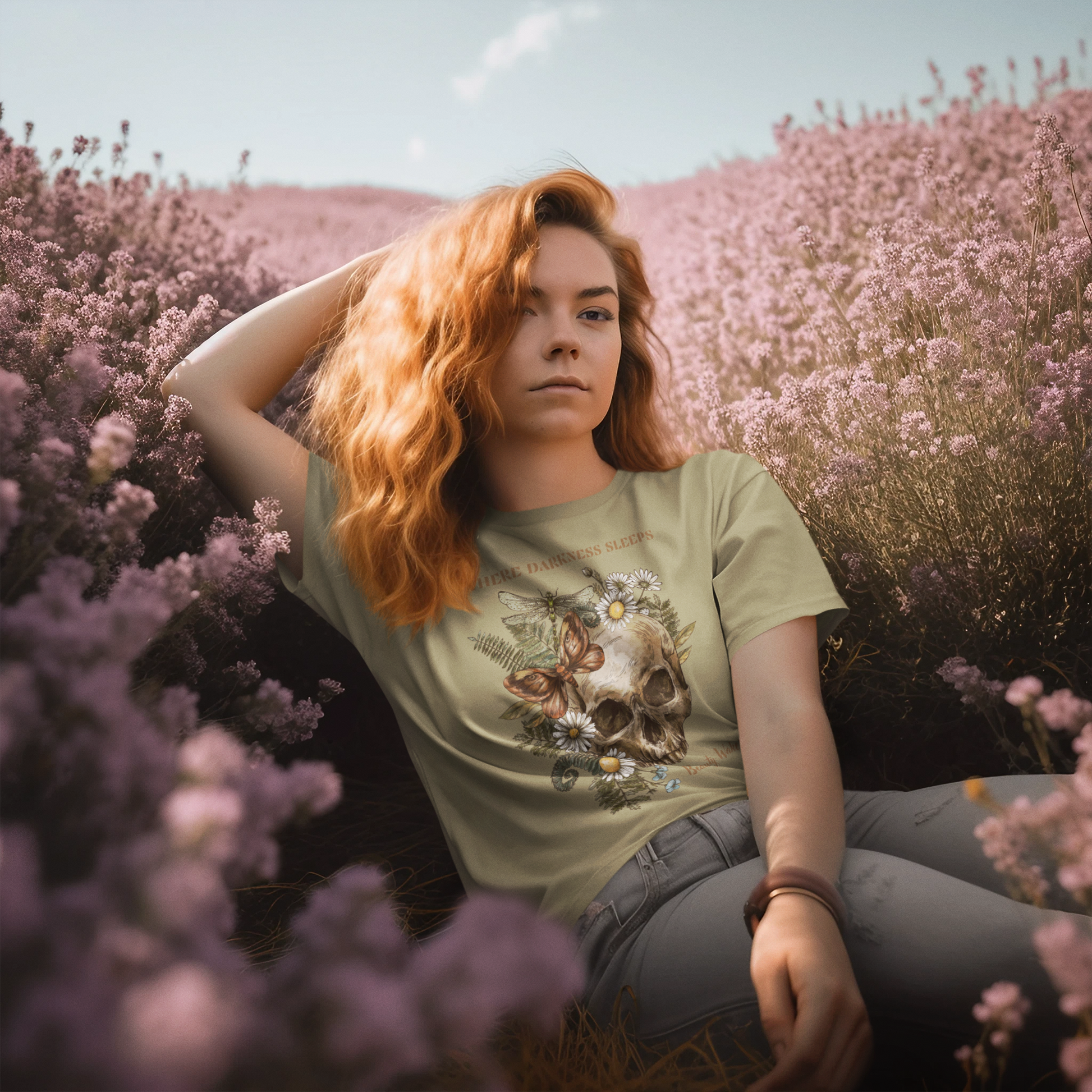 Step into the mysterious and the beautiful with our Beauty in the Shadows tee. Featuring a hauntingly elegant design of a vintage skull entwined with daisies, ferns, and a delicate butterfly, this shirt celebrates the quiet power of contrast - where darkness rests, beauty rises. Printed on a soft, breathable fabric, it's perfect for those who love a little edge with their charm.